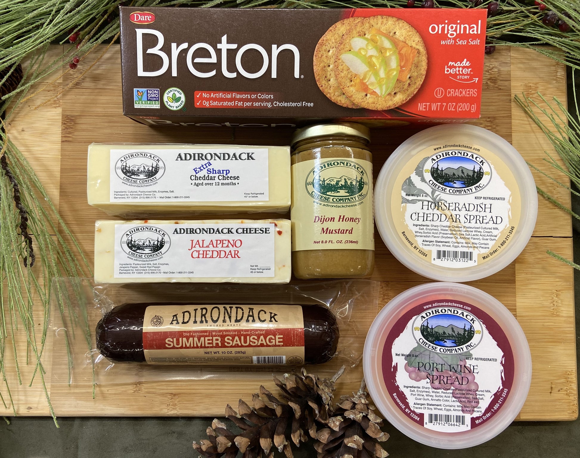 This one has it all. A bar of our Extra Sharp White Cheddar, a bar of our Jalapeno Cheddar, two 8 oz. Cheddar Spreads; a Horseradish and a Port Wine, a Summer Sausage, an 8 oz. jar of our own Honey Dijon Mustard, and a box of Premium Crackers...let the party begin!